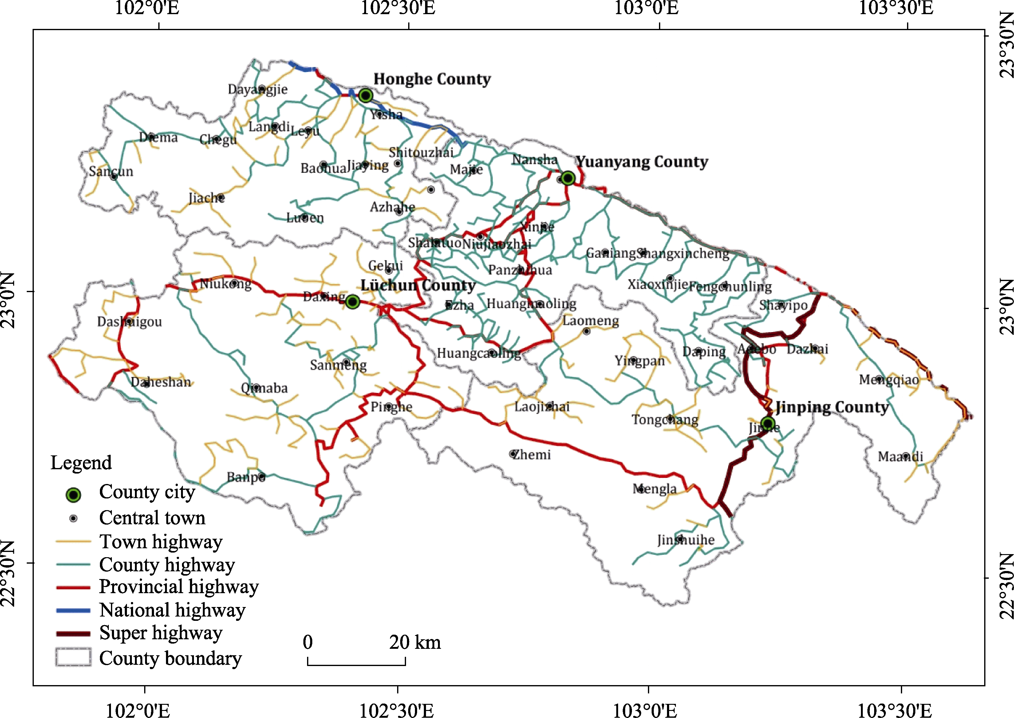 | 1 | Yisa | Honghe | 0.04 | 18 | Jiaying | Honghe | 1.07 | 35 | Fengchunling | Yuanyang | 2.04 |