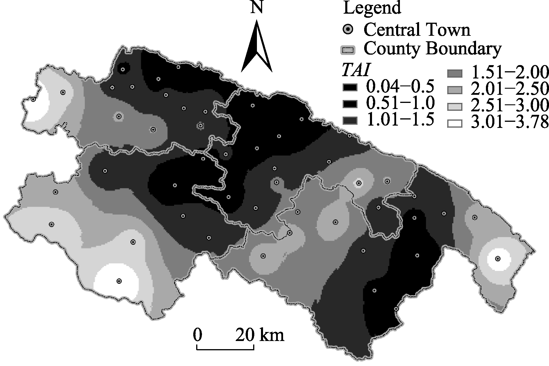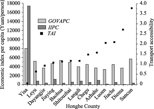 Fig. 4 Economic situations and TAIs of towns in Honghe County in 2014 |