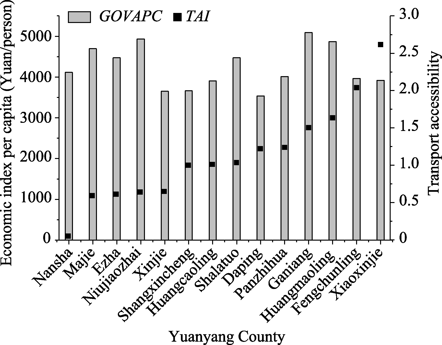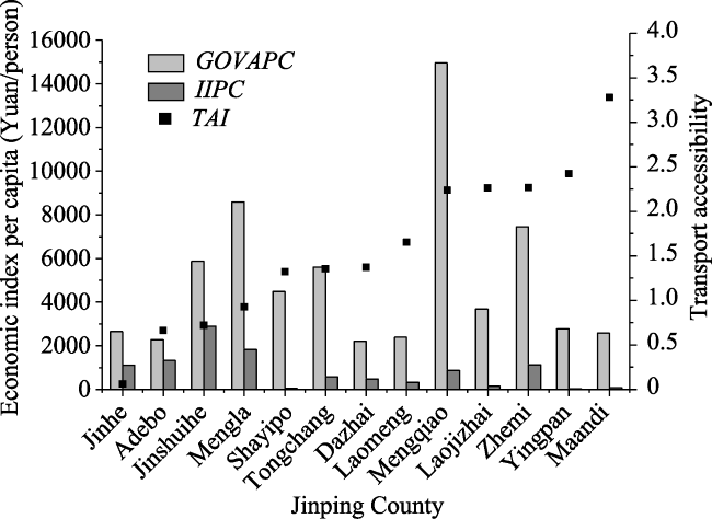 Fig. 7 Economic situations and TAIs of towns in Jinping County |