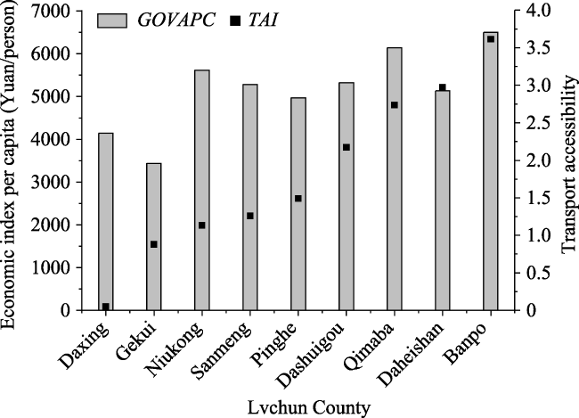 Fig. 6 Economic situations and TAIs of towns in Lvchun County in 2014 |