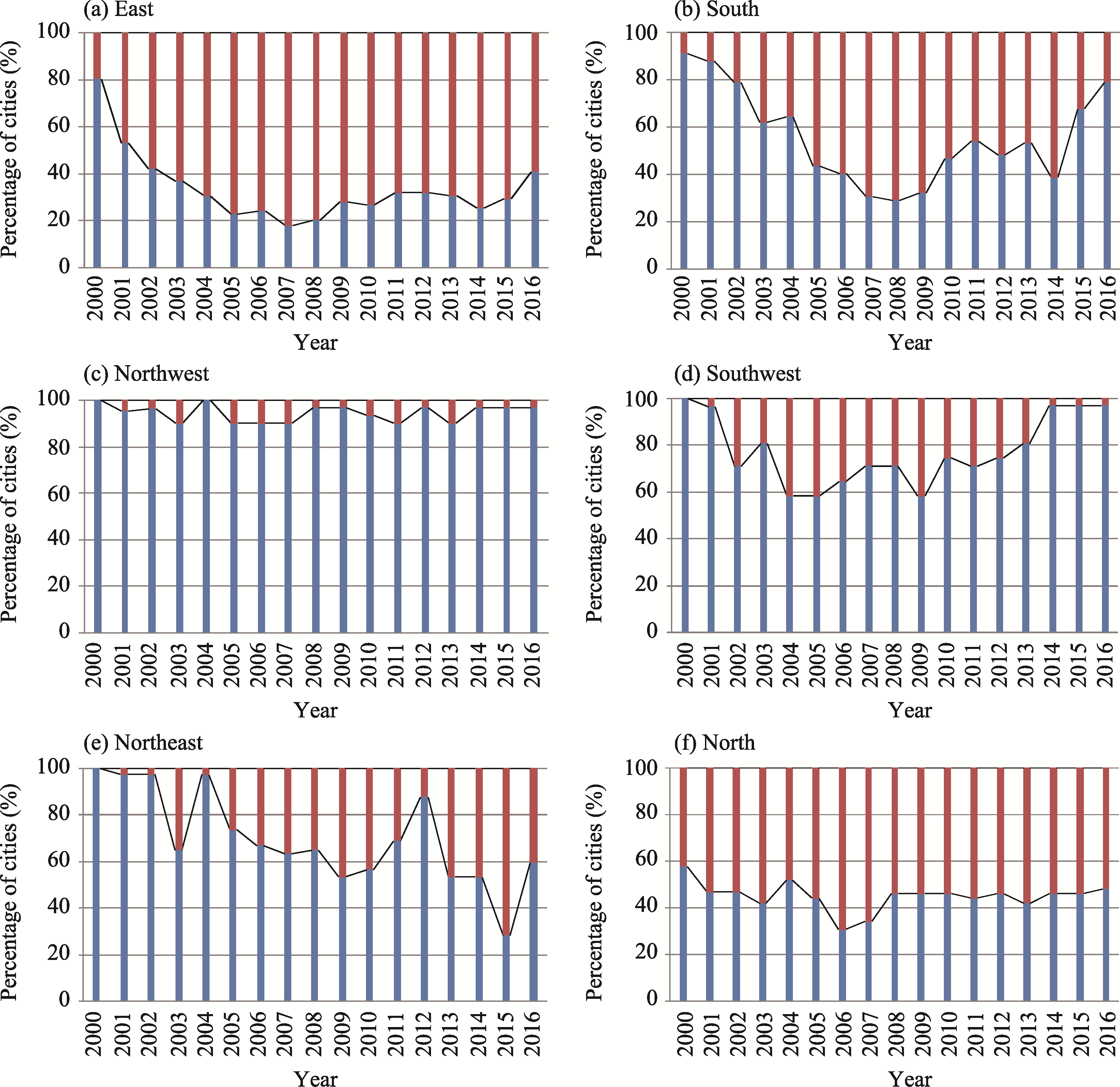 Fig. 3 The percentages of the high-pollution and low-pollution cities in different regions from 2000 to 2016 |