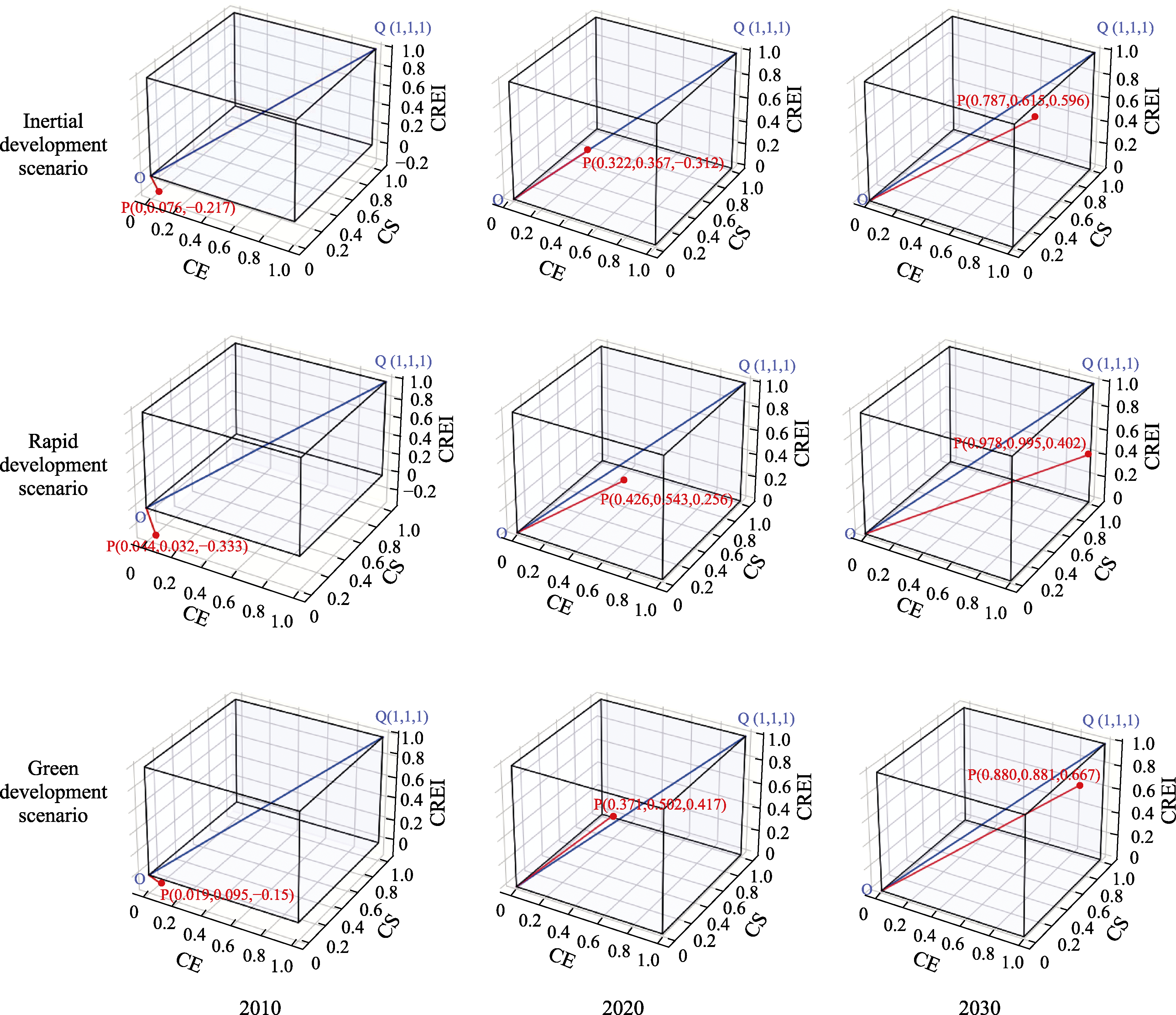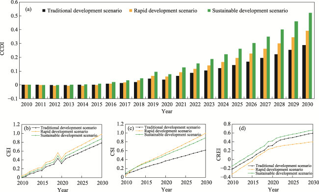 Fig. 9 The CCDI, CEI, CSI and CREI under the three scenarios from 2010 to 2030 |