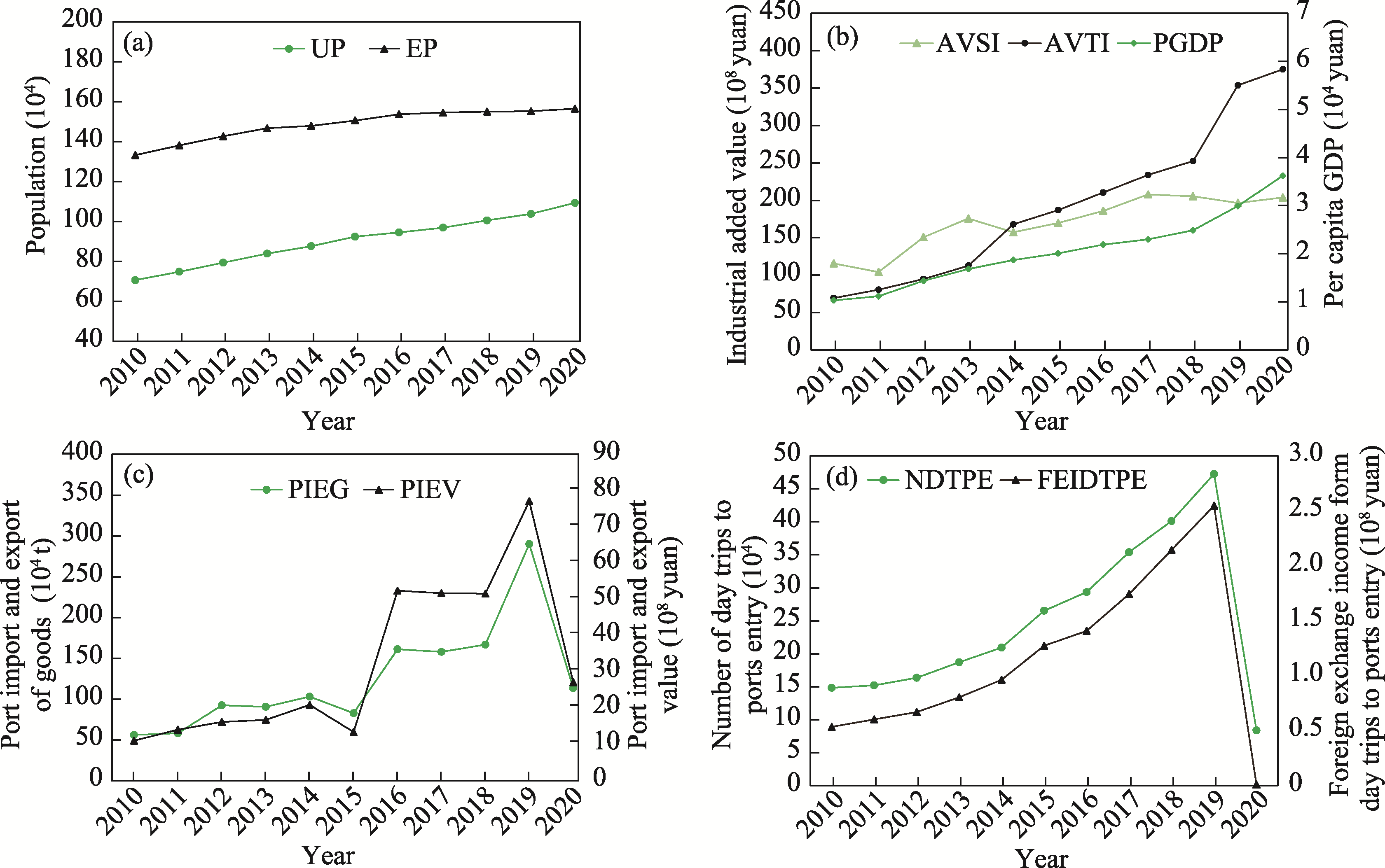 Fig. 2 Overview of the economic and social conditions in Lincang CityNote: (a) Depicts the urban population and employed population (UP, EP) of Lincang City; (b) Shows the per capita GDP and the value-added contributions of the secondary and tertiary industries (PGDP, AVSI, AVTI) in Lincang City from 2010 to 2020; (c) Displays the volumes and values of imports and exports through the ports (PIEG, PIEV) in Lincang City; and (d) Illustrates the number of inbound one-day tourists and the foreign exchange income generated from inbound one-day tourists (NDTPE, FEDTPE) at the ports. |