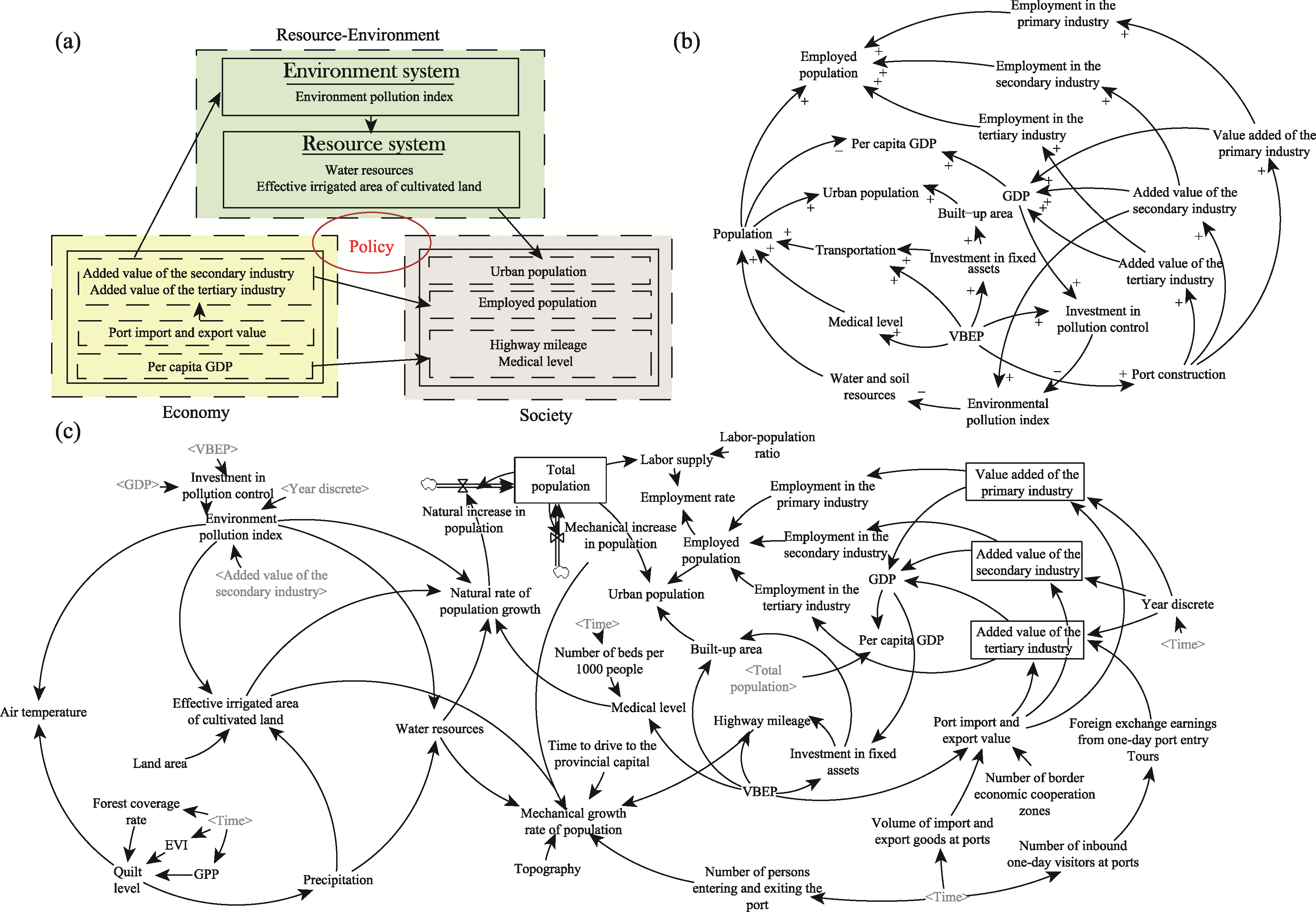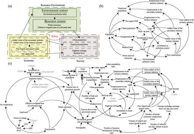 Fig. 3 BCCD-SD model construction diagramNote: (a) Depicts the conceptual model of BCCD-SD, listing only a subset of key indicators. (b) Presents the causal loop diagram of the model, with each arrow indicating the feedback direction. The polarity (“+” for positive, “-” for negative) on each connecting line represents the direction of change caused by that factor. (c) Shows the complete flowchart of the BCCD-SD model. In this figure, VBEP represents China’s “Vitalizing Border Areas and Enriching the People” policy, and the Environmental Pollution Index is synthesized by averaging the weighted values of solid waste emissions, wastewater emissions, and sulfur dioxide emissions. |