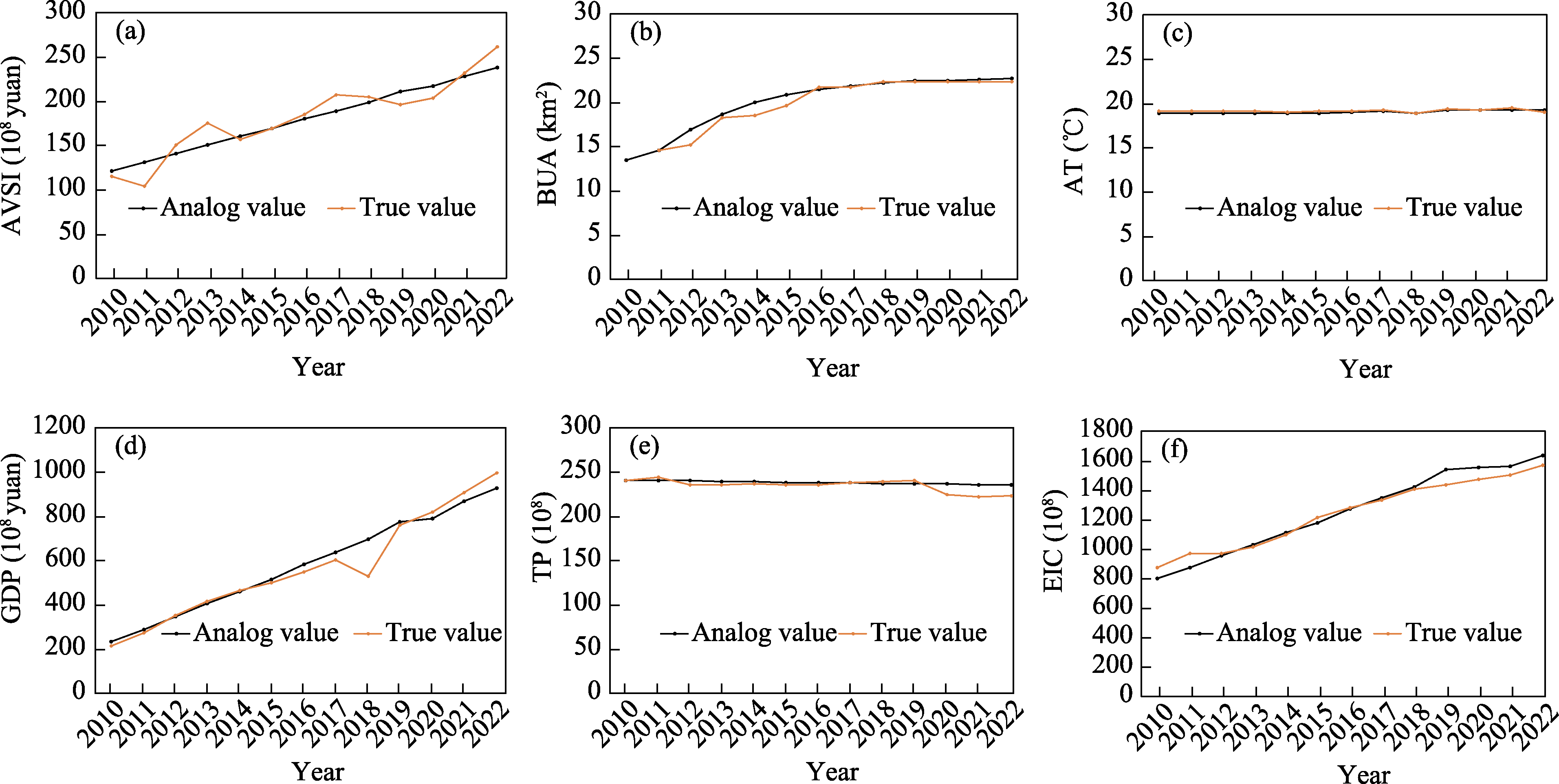 Fig. 5 Comparisons between the simulated values of six indicators under the inertia development scenario and their actual values from 2010 to 2022 |