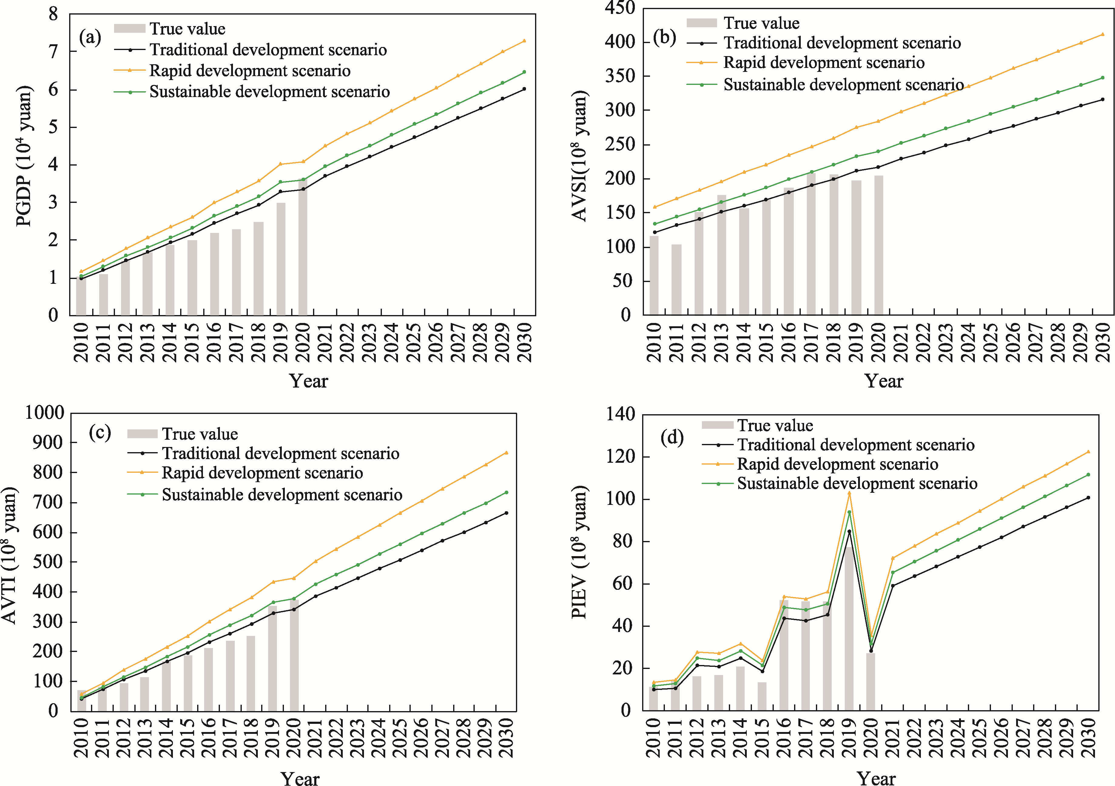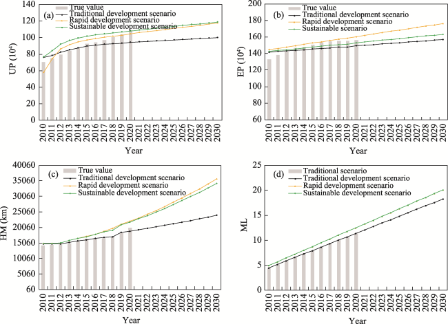 Fig. 7 The city society subsystem under the three scenarios from 2010 to 2030Note: In Fig. 7d, the curve representing the green development scenario overlaps with that of the rapid development scenario. |