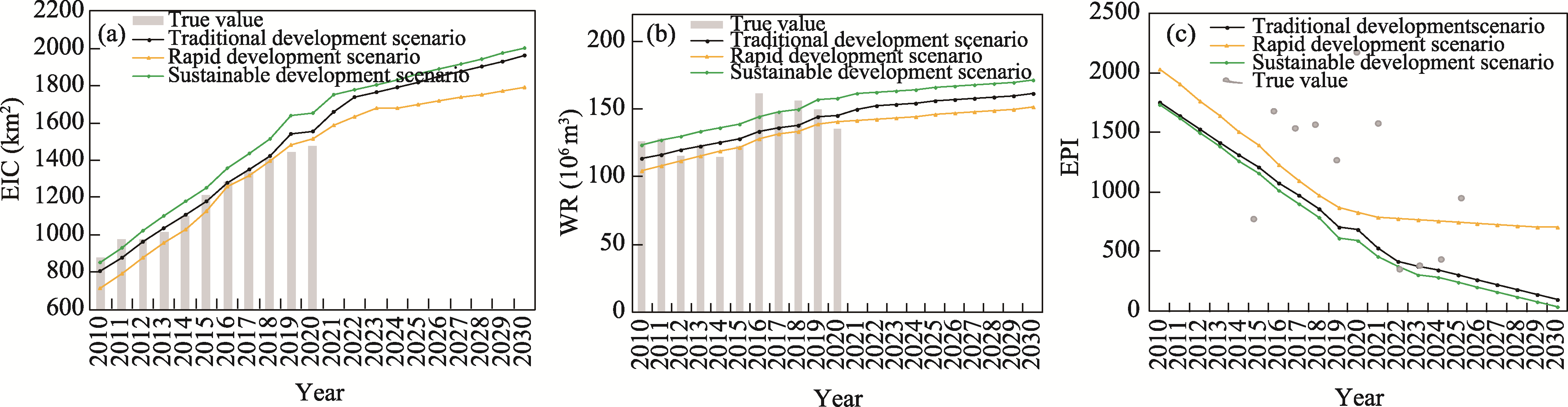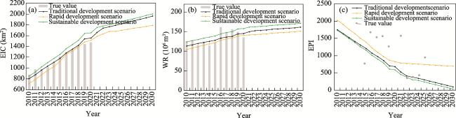 Fig. 8 The city resource-environment subsystem under the three scenarios from 2010 to 2030 |