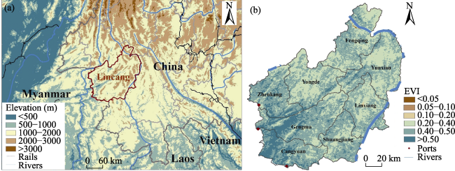 Fig. 1 Overview of the natural conditions of Lincang CityNote: (a) Displays the topographic elevation map of Lincang City and its location along the southwestern border of China, while (b) Illustrates the Enhanced Vegetation Index (EVI) in Lincang City. |