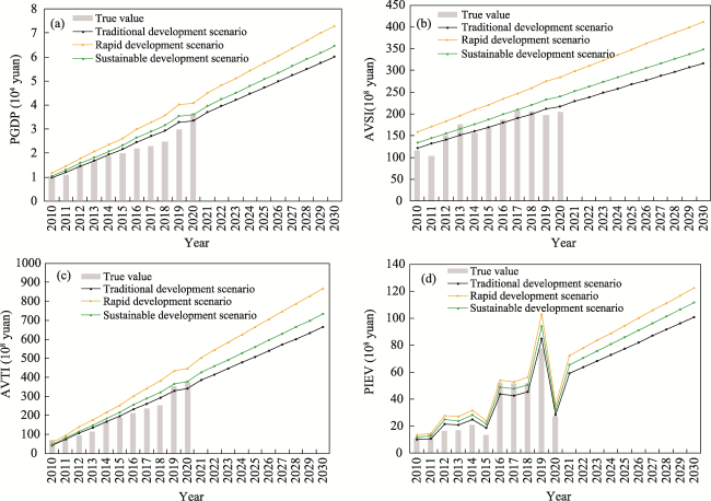 Fig. 6 The city economy subsystem under the three scenarios from 2010 to 2030 |