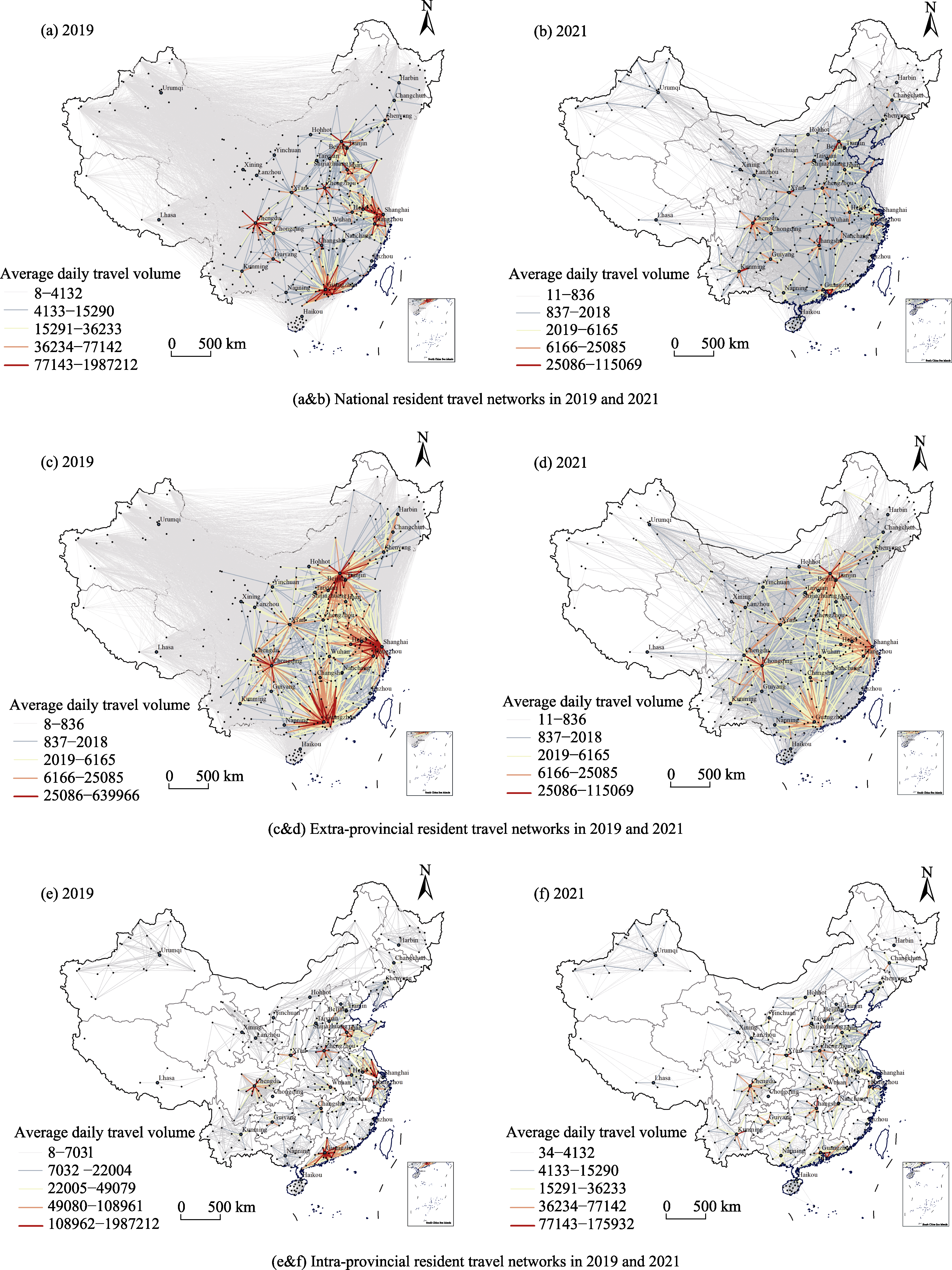 Figure 3 Spatial patterns of China’s National Day holiday travel networks in 2019 and 2021Note: Hong Kong, Taiwan, and Macao were excluded from this study due to difficulties in obtaining data. |