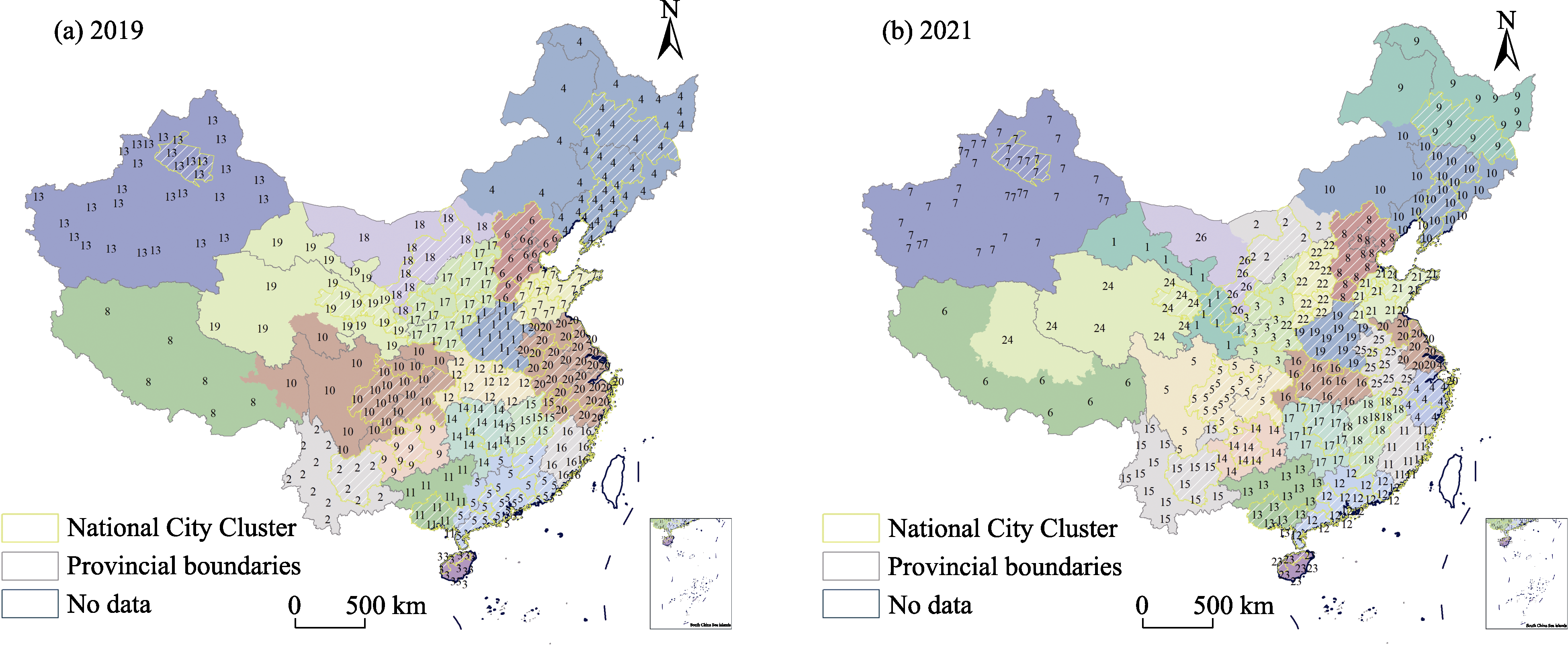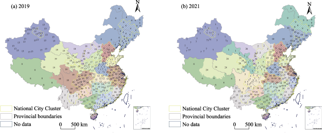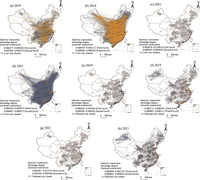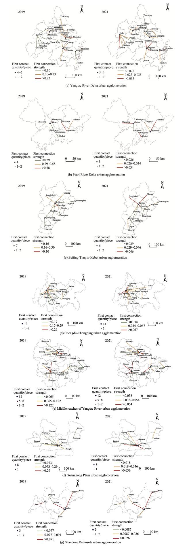 Figure 7 Spatial pattern of top linkages of the urban agglomerations in China in 2019 and 2021 |