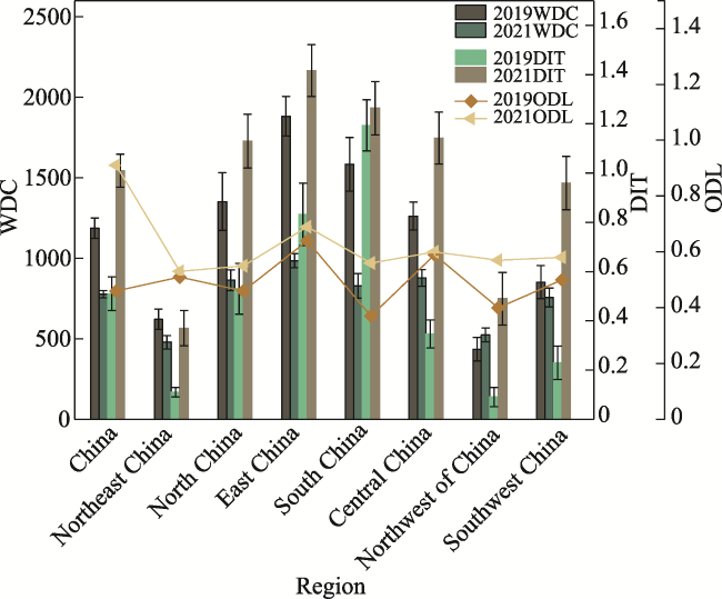 Figure 1 Comparison of the urban resident travel network structure indicators between the six major regions of China on the National Day holidays in 2019 and 2021 |