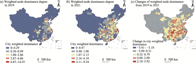 Figure 2 Spatial patterns of weighted node dominance of the urban resident travel networks in ChinaNote: Hong Kong, Taiwan and Macao were excluded from this study due to difficulties in obtaining data. |