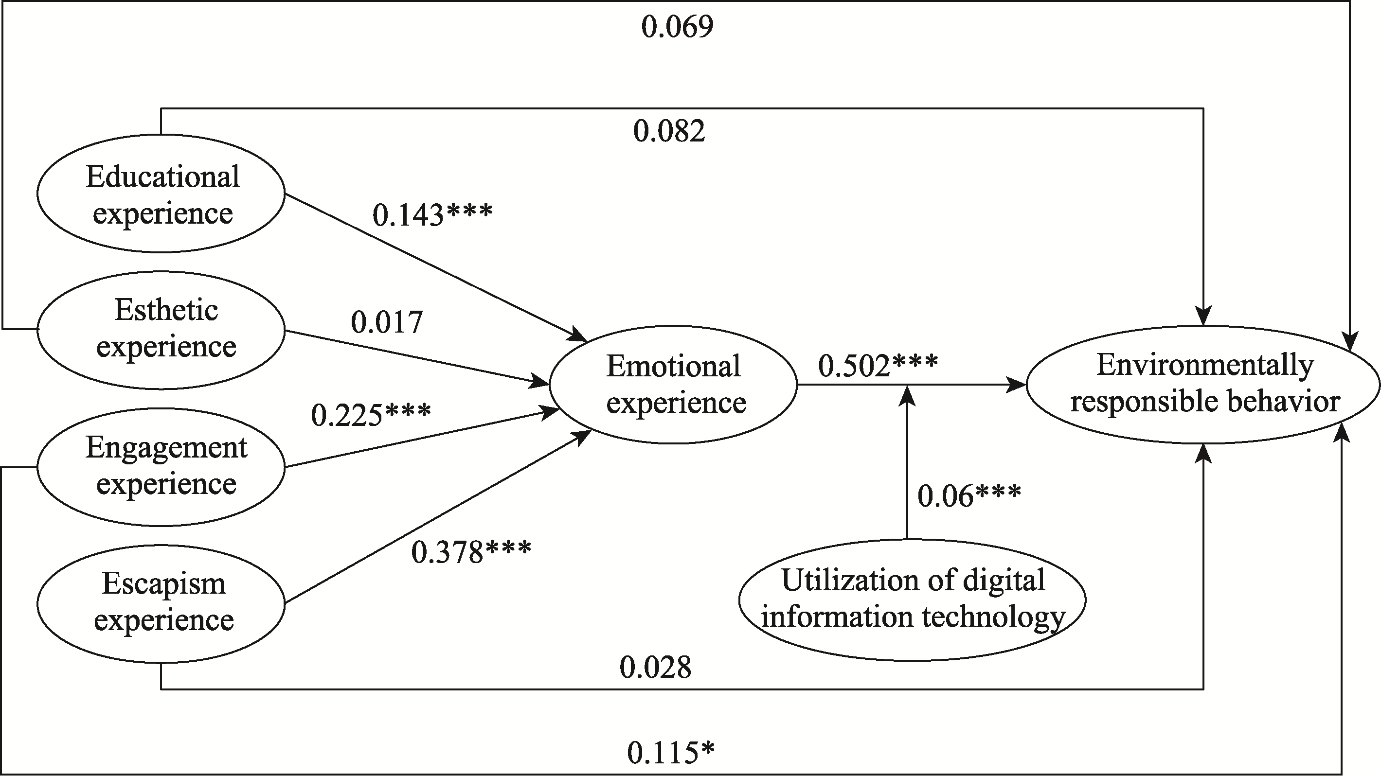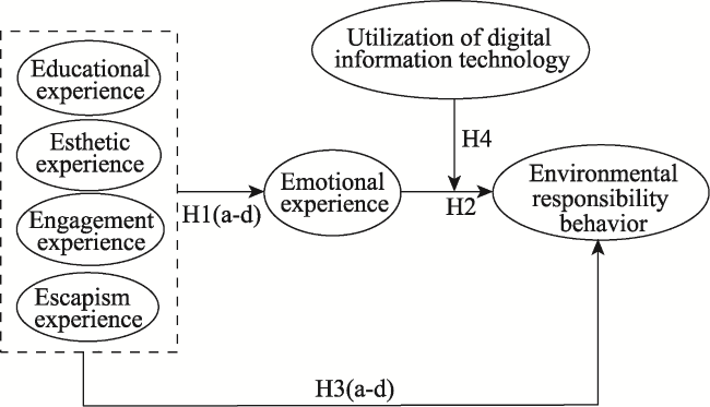 Note: The path of effect 1: educational experience → emotional experience → environmentally responsible behavior; the path of effect 2: esthetic experience → emotional experience → environmentally responsible behavior; the path of effect 3: engagement experience → emotional experience → environmentally responsible behavior; the path of effect 4: escapism experience → emotional experience → environmentally responsible behavior. |