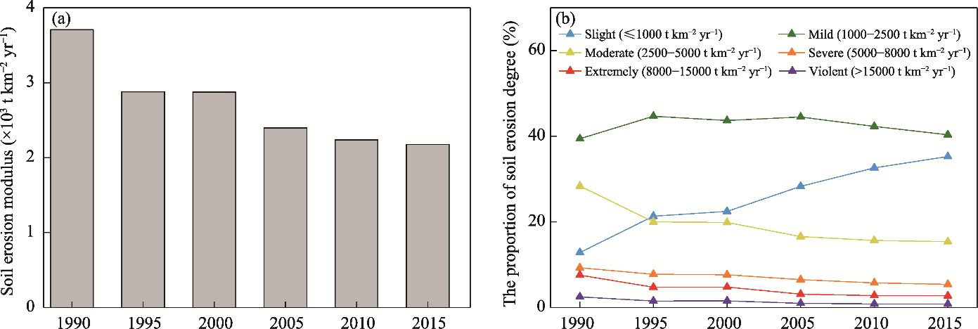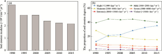 Figure 2 The soil erosion modulus (a) and proportion of soil erosion degree (b) in Luoyugou Watershed from 1990 to 2015 |
