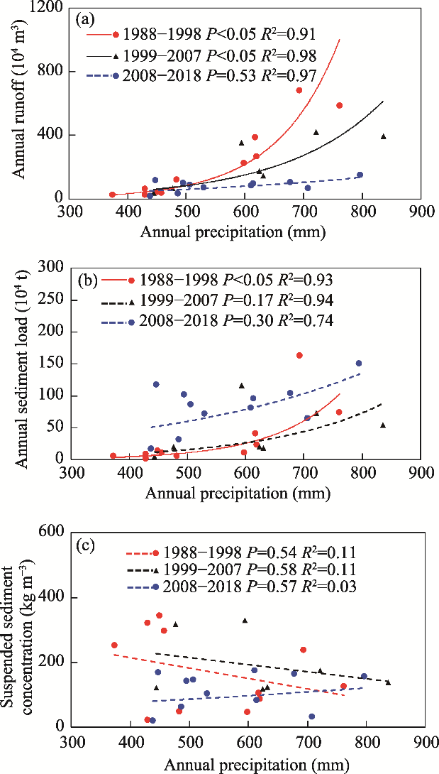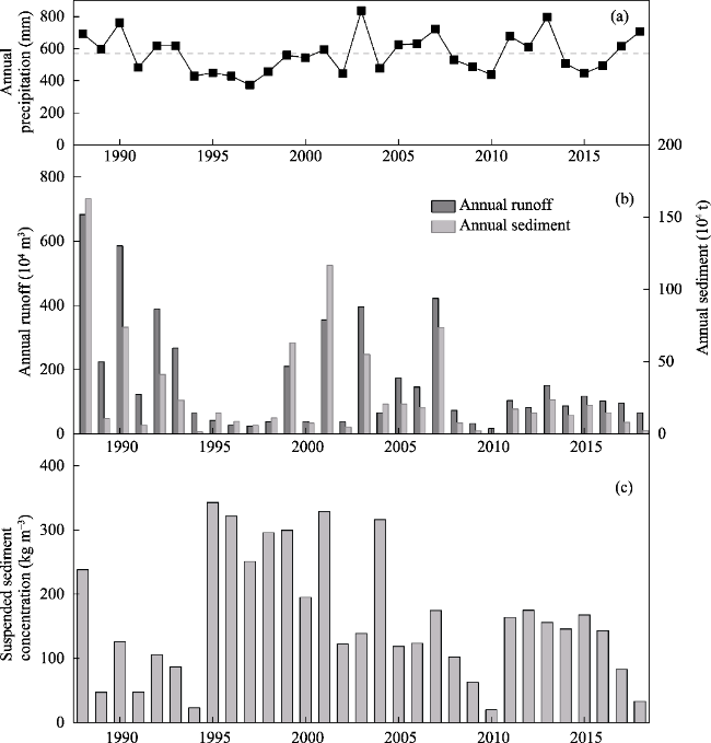 Figure 4 Annual precipitation (a), annual runoff and sediment yield (b), suspended sediment concentration (c) of Luoyugou Watershed from 1988 to 2018 |