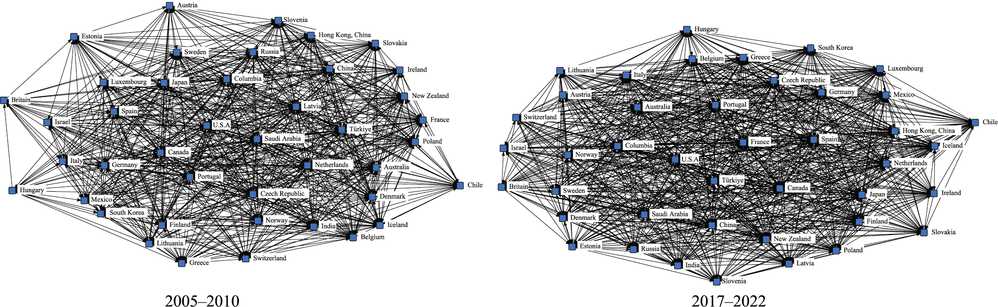 Figure 1 Complete networks of global productive service trade from 2005-2010 and 2017-2022 |