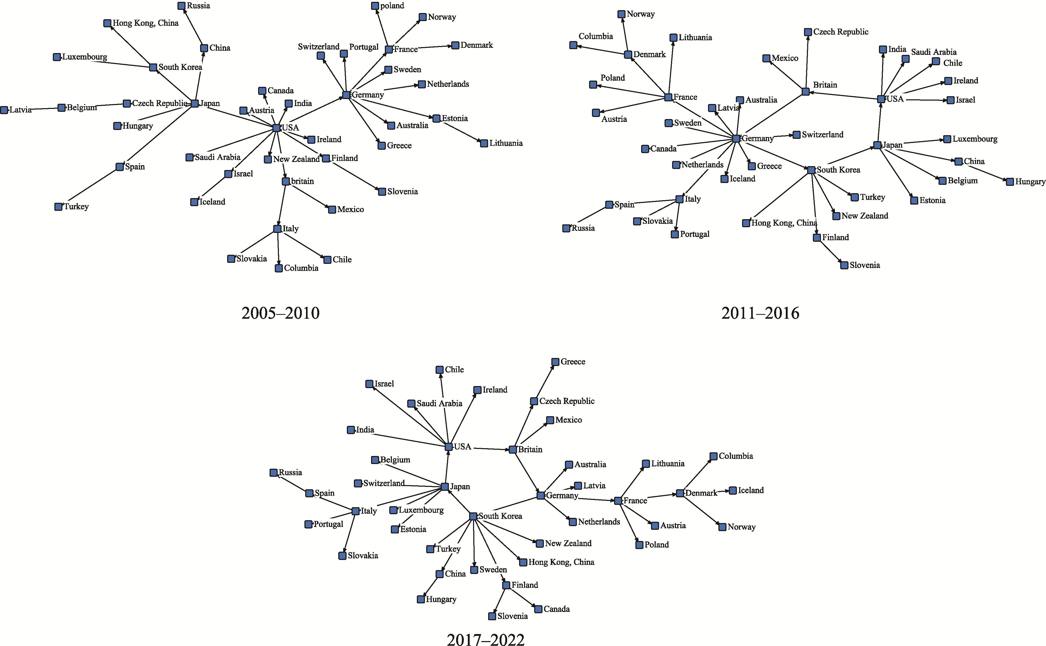 Figure 2 Top 1 network structures of global productive service trade from 2005-2010, 2011-2016, and 2017-2022 |