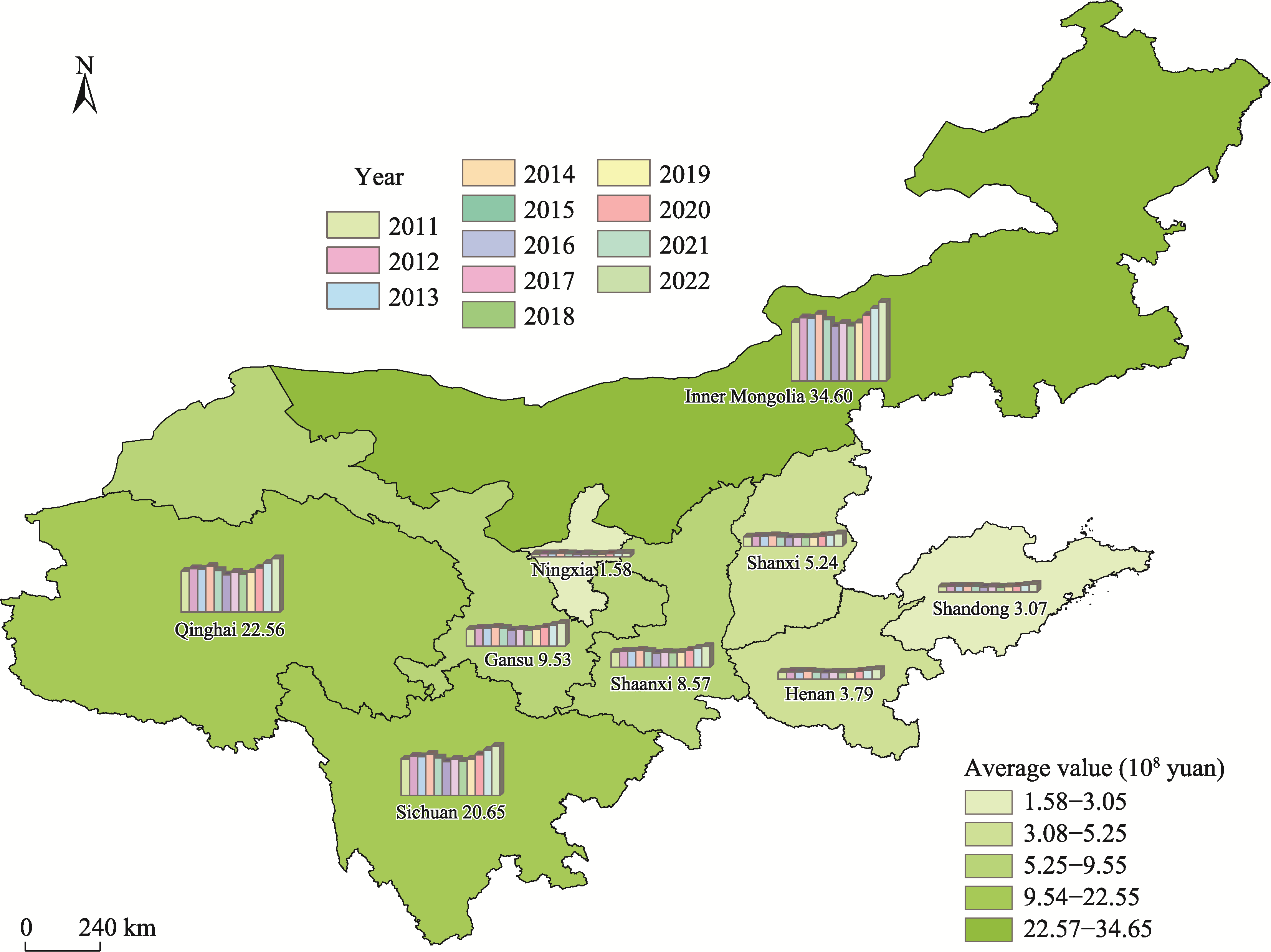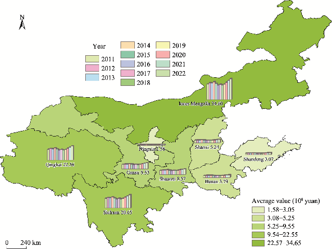 Figure 2 Changes in the spatial pattern of ESV in the Yellow River BasinNote: For each province, the embedded column chart displays the annual ecosystem service value (ESV) for 2011-2022. |