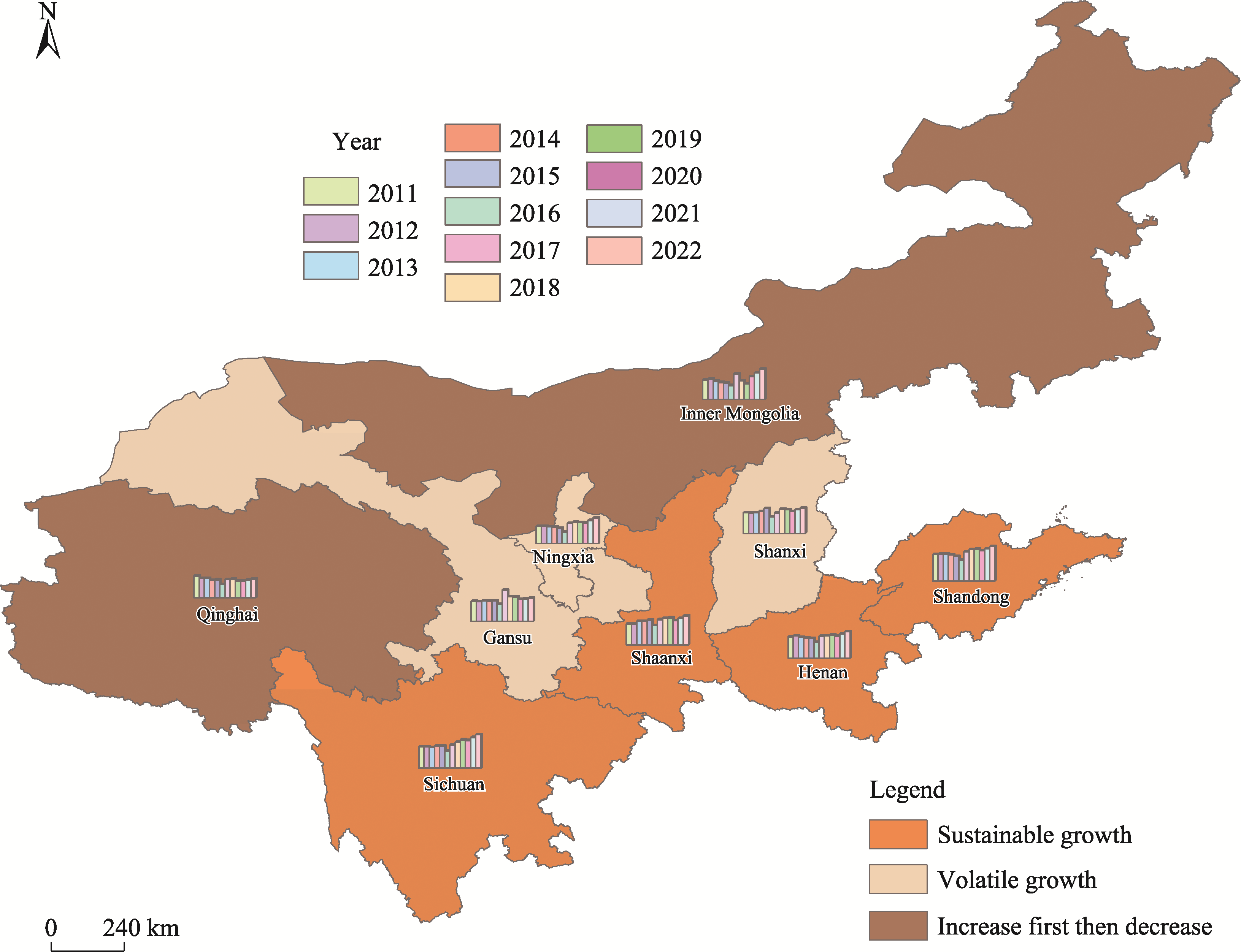 Figure 3 Changes in the spatial pattern of the high-quality development indices in the Yellow River BasinNote: For each province, the inset column chart depicts annual high-quality development indices. |