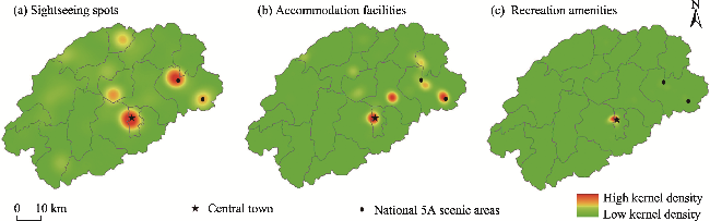 Figure 1 Kernel density distributions of the elements of sightseeing, accommodation, and recreation in Wuyuan |