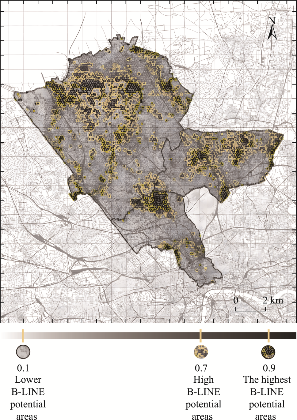 Figure 3 The potential B-LINE with suitability values |