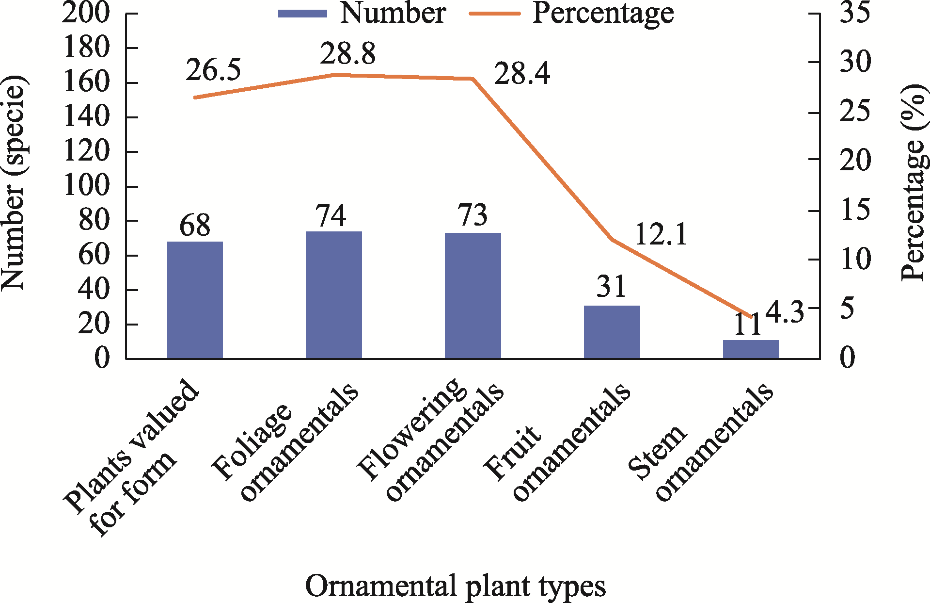 | Plants valued for form | Foliage ornamentals | Flowering ornamentals | Fruit ornamentals | Stem ornamentals | Total number | |||||