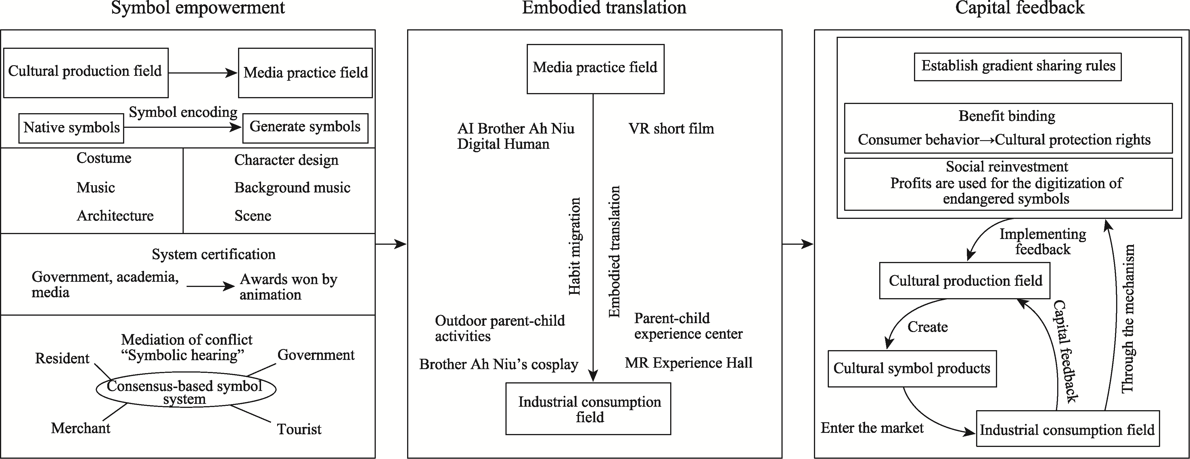 This study takes the children’s animation IP “Brave Brother Ah Niu” as a case study, where the animation IP refers not merely to a single work, but rather to a core content asset capable of multi-dimensional development and possessing long-term commercial value, such as a well-known character, story, or worldview. This case is used to explore the path for children’s animation IP to empower the deep integration of cultural tourism based on Bourdieu’s field theory. In response to the current challenges of fragmentation, superficial symbolization, and capital feedback disruption in development, a three-field transformation framework of “cultural production-media practice- industrial consumption” is constructed, and an integration mechanism of “empowerment-translation-feedback” is proposed. This study provides a replicable theoretical model and practical path for the Ah Niu IP and similar regional children’s animation IPs to overcome the bottleneck of cultural tourism integration, achieve cultural inheritance, and enhance the industrial value.