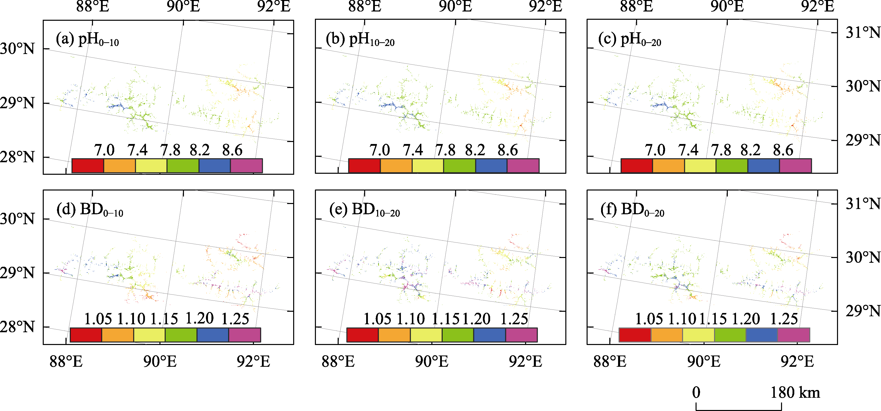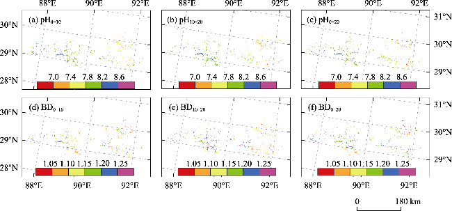 Figure 1 Spatial distributions of soil (a) pH at 0-10 cm (pH0-10), (b) pH at 10-20 cm (pH10-20), (c) pH at 0-20 cm (pH0-20), (d) bulk density (BD, g cm‒3) at 0-10 cm (BD0-10), (e) BD at 10-20 cm (BD10-20) and (f) BD at 0-20 cm (BD0-20)e: In the legends, each number corresponds to the boundary value of two colors. The same below. |