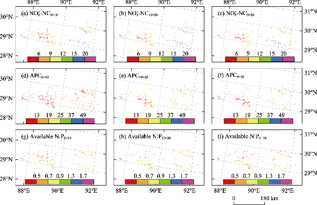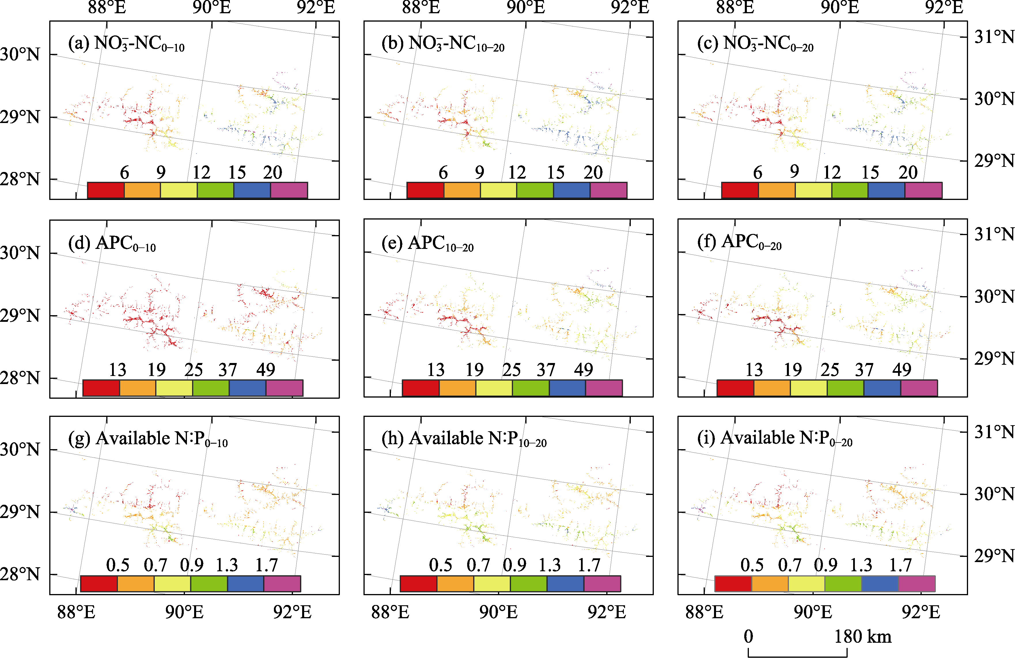 Figure 2 Spatial distributions of soil (a) nitrate nitrogen concentration (NO3‒-NC, mg kg‒1) at 0-10 cm (NO3‒-NC0-10), (b) NO3‒-NC at 10-20 cm (NO3‒-NC10-20), (c) NO3‒-NC at 0-20 cm (NO3‒-NC0-20), (d) available phosphorus concentration (APC, mg kg‒1) at 0-10 cm (APC0-10), (e) APC at 10-20 cm (APC10-20), (f) APC at 0-20 cm (APC0-20), (g) ratio of available nitrogen to phosphorus (available N:P) at 0-10 cm (available N:P0-10), (h) available N:P at 10-20 cm (available N:P10-20) and (i) available N:P at 0-20 cm (available N:P0-20) |