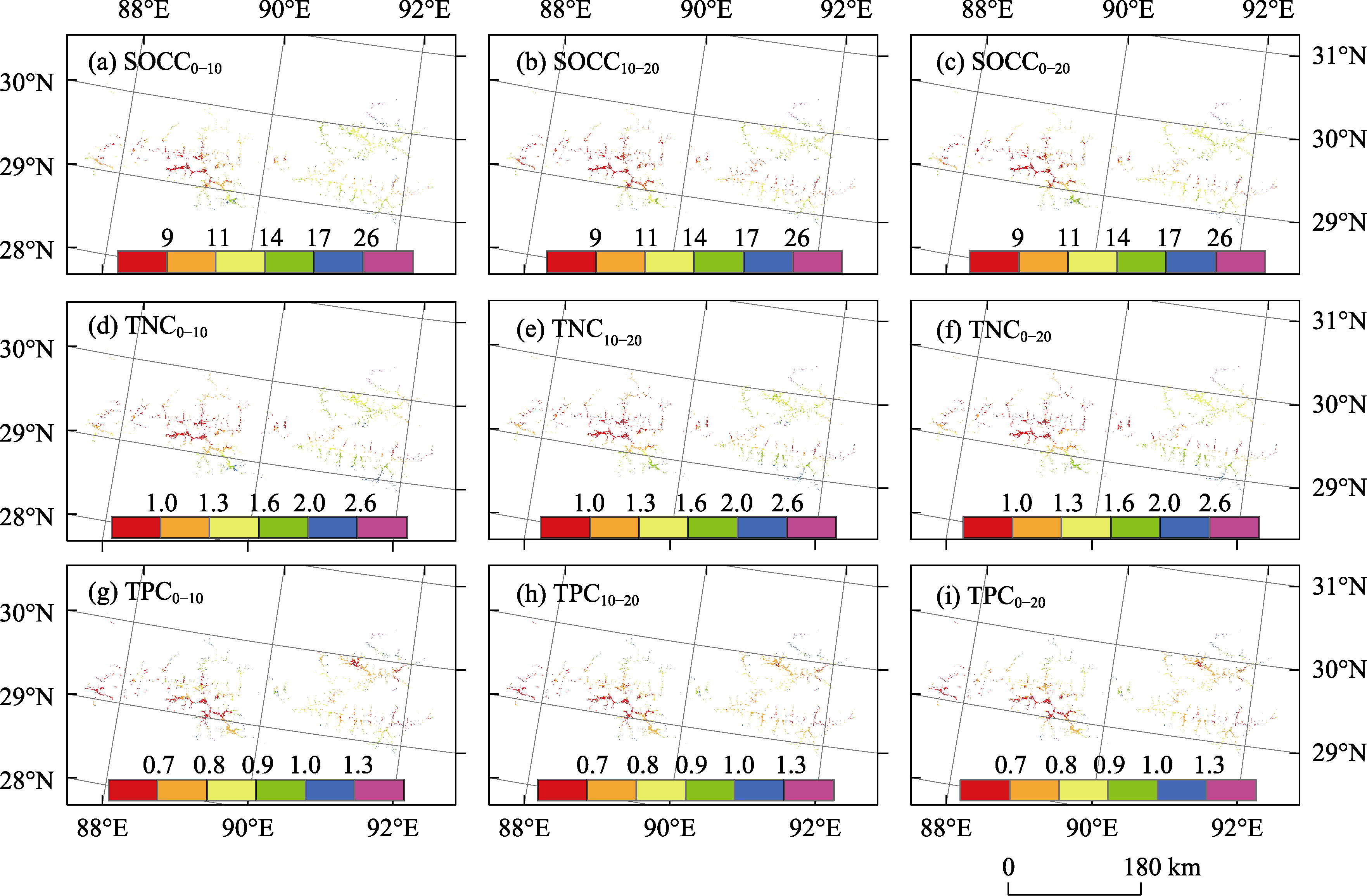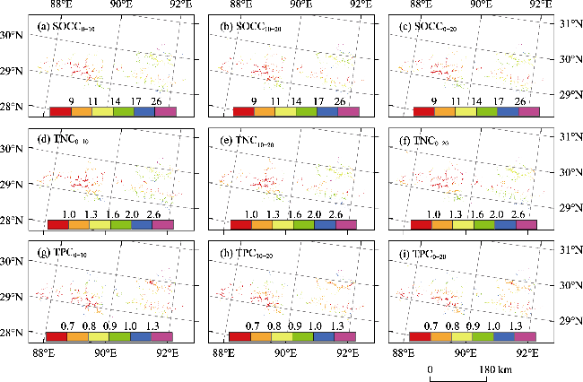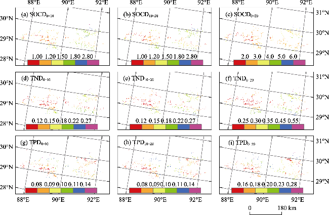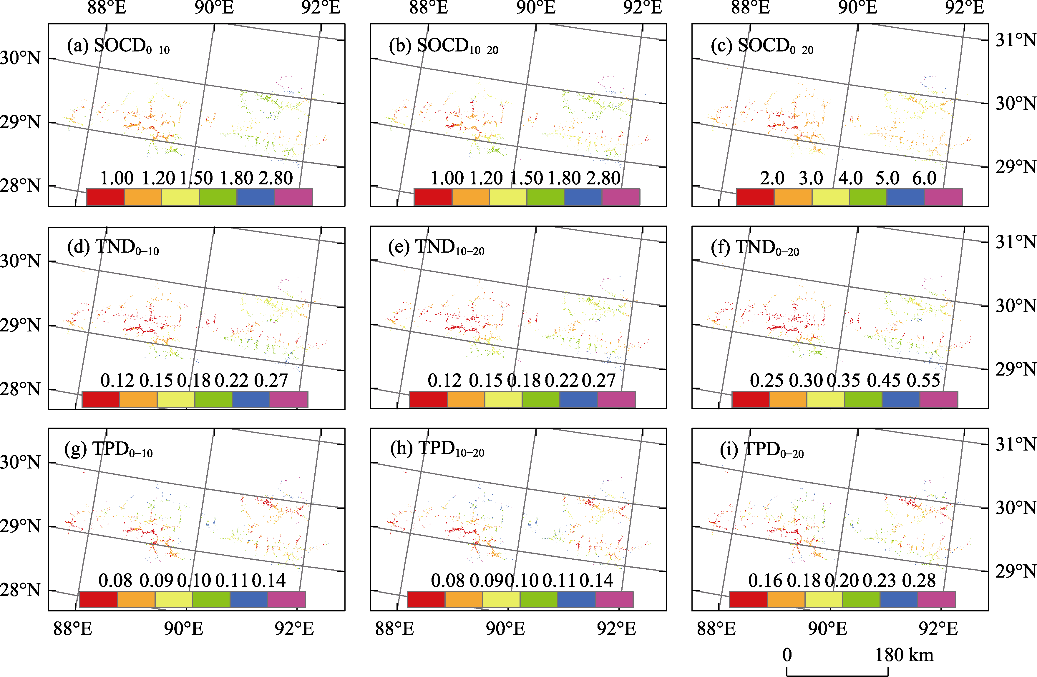 Figure 5 Spatial distributions of soil (a) organic carbon density (SOCD, kg m‒2) at 0-10 cm (SOCD0-10), (b) SOCD at 10-20 cm (SOCD10-20), (c) SOCD at 0-20 cm (SOCD0-20), (d) total nitrogen density (TND, kg m‒2) at 0-10 cm (TND0-10), (e) TND at 10-20 cm (TND10-20), (f) TND at 0-20 cm (TND0-20), (g) total phosphorus density (TPD) at 0-10 cm (TPD0-10, kg m‒2), (h) TPD at 10-20 cm (TPD10-20) and (i) TPD at 0-20 cm (TPD0-20) |