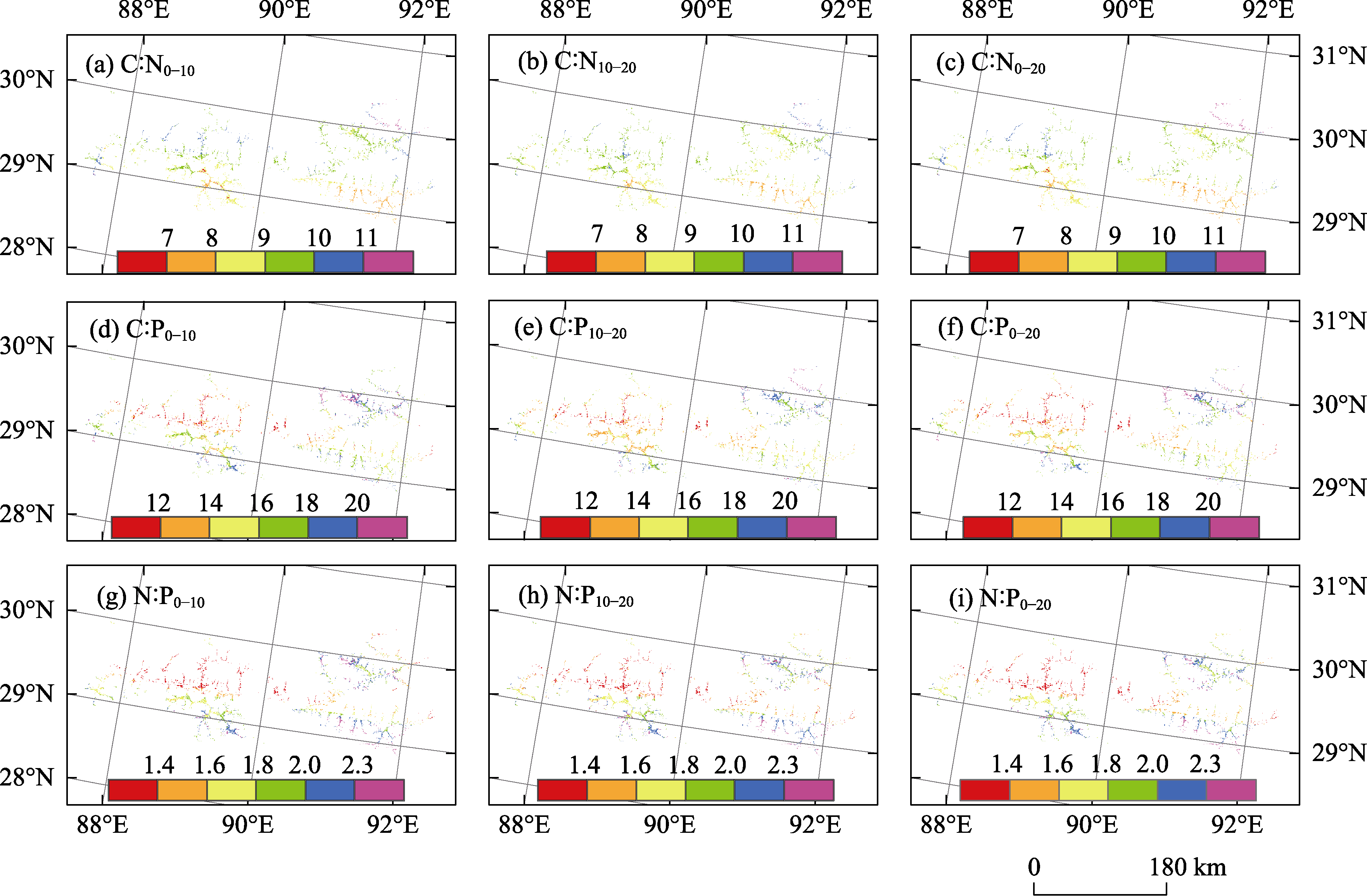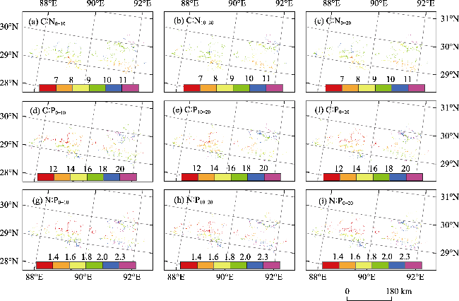 Figure 4 Spatial distributions of the (a) ratio of soil organic carbon to total nitrogen (C:N) at 0-10 cm (C:N0-10), (b) C:N at 10-20 cm (C:N10-20), (c) C:N at 0-20 cm (C:N0-20), (d) ratio of soil organic carbon to total phosphorus (C:P) at 0-10 cm (C:P0-10), (e) C:P at 10-20 cm (C:P10-20), (f) C:P at 0-20 cm (C:P0-20), (g) ratio of total nitrogen to total phosphorus (N:P) at 0-10 cm (N:P0-10), (h) N:P at 10-20 cm (N:P10-20) and (i) N:P at 0-20 cm (N:P0-20) |
